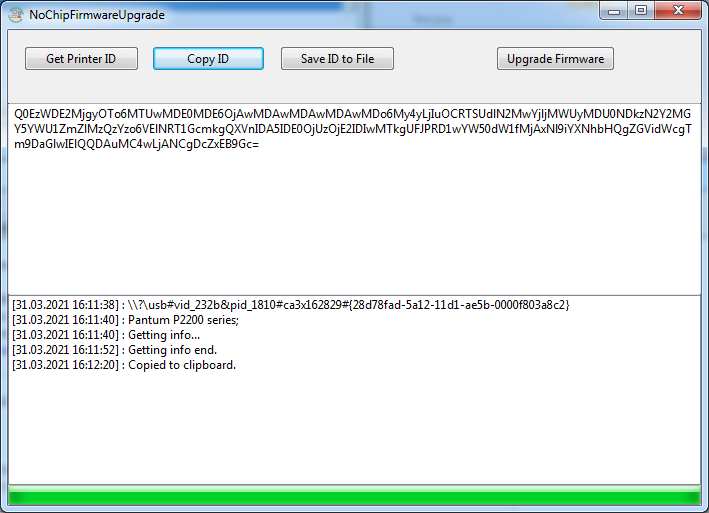 - Далее нажмите кнопку “Get Printer ID” и дождитесь получения информации. В верхней части окна отобразится уникальный идентификатор принтера (ID), необходимый для заказа бесчиповой прошивки. Его можно скопировать (Copy ID) либо сохранить в файл (Save ID to File), перейдите на страницу заказа, вставьте ID и нажмите "Отправить".